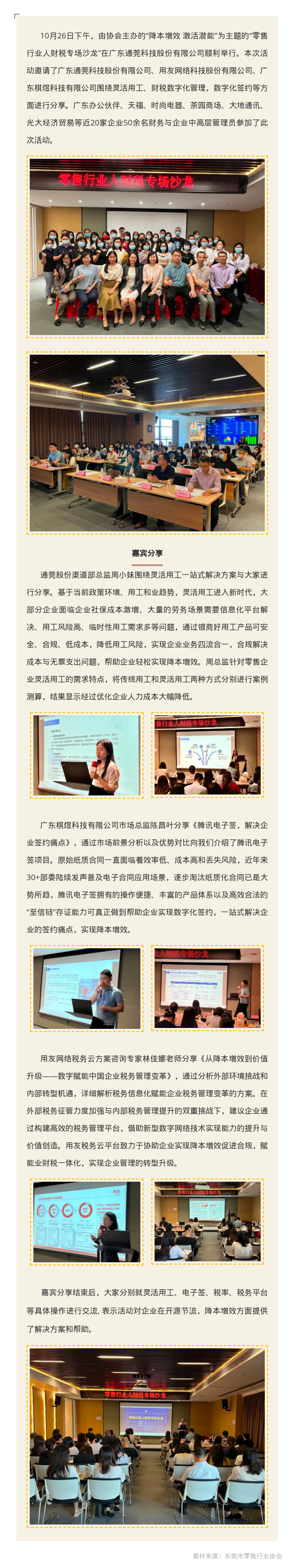 10月26日下午,由协会主办的“降本增效 激活潜能”为主题的“零售行业人财税专场沙龙"在广东通莞科技股份有限公司顺利举行。本次活动邀请了广东通莞科技股份有限公司、用友网络科技股份有限公司、广东棋煜科技有限公司围绕灵活用工、财税数字化管理,数字化签约等方面进行分享。广东办公伙伴、天福、时尚电器、茶园商场、大地通讯光大经济贸易等近20家企业50余名财务与企业中高层管理员参加了此次活动。